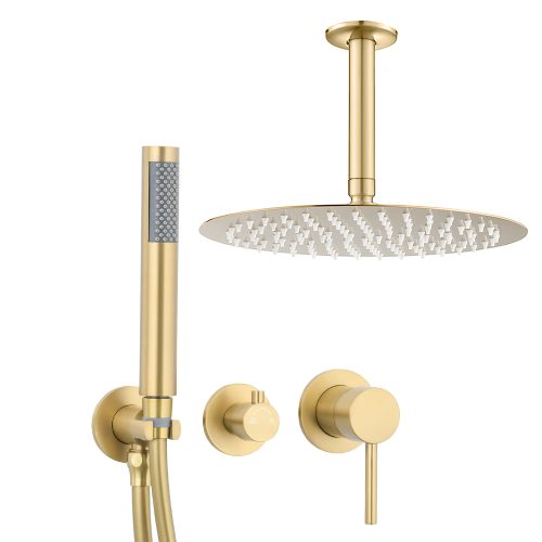 Ducha empotrada monomando redonda con pulsadores a techo dorado cepillado – Serie Navia