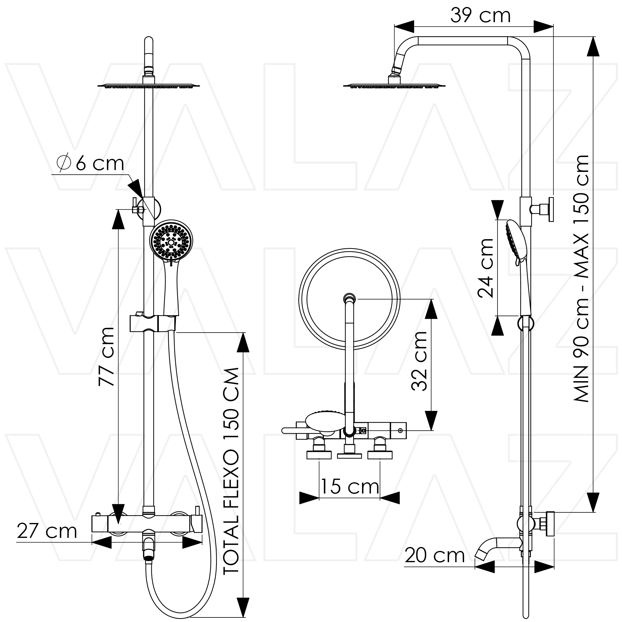 Materiales: Cuerpo en latón, rociador en acero inoxidable, alcachofa de mano y flexo en PVC